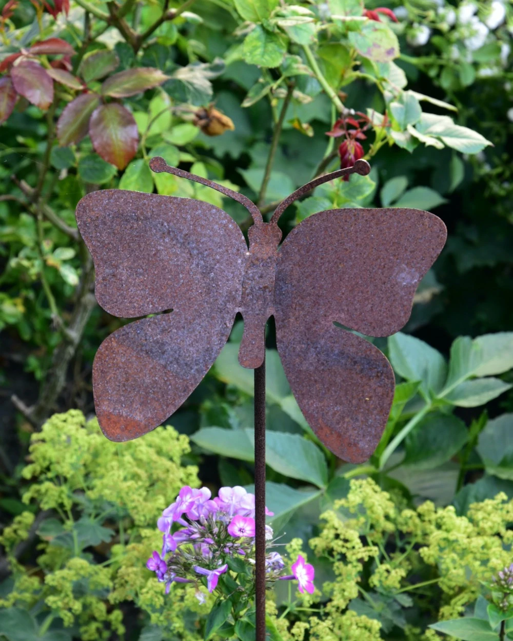 Vlinder op tuinprikker ecoroest. Deze leuke vlinder staat op een tuinprikker en is van ecoroest. U kunt de vlinder zo in de tuin steken en leuk combineren met de tuin bloemen. De vleugels zijn nog voorzichtig iets in de juiste positie te buigen (doe dit eenmalig, nadat de vlinder een poos in weer in wind staat kan het proces doorgaan en verhard het iets waardoor de buigzaamheid niet meer is aan te raden). Deze leuke vlinder geven een mooi silhouet in de tuin en passen prachtig tussen andere ecoroest bloemen en echte bloemen/planten in de tuin.