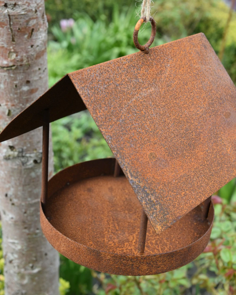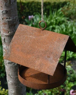 Vogel voeder huisje van ecoroest met ophang oog. Dit leuke vogel voeder huisje heeft een normaal rechthoekig dat, met een ronde bodem. In het huisje hangt een haak waar u een voederbal aan kunt hangen zodat het vogelvoer droog hangt. Op het dak zit een ophang oog waar een een touw of ketting aan kunt hangen om hem bv in een boom of aan de overkapping te hangen.