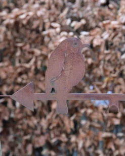 Voederpijl met vogel. Dit leuke vogeltje zit op een pijl die lijkt wel in de ‘paal’ te zijn geschoten. Aan de pijl zit een haak zodat u er een zakje pinda’s aan kunt hangen. De voederpijl is van metaal gemaakt die door een speciale behandeling een mooie roestlaag heeft gekregen. aan de pijl zit een schroef, zodat u hem gemakkelijk in een boompaal, schuttig of houten schuur kunt draaien en kunt genieten van de vogels die komen eten van het voer wat u aan de haak hangt.