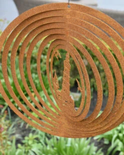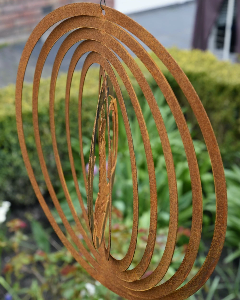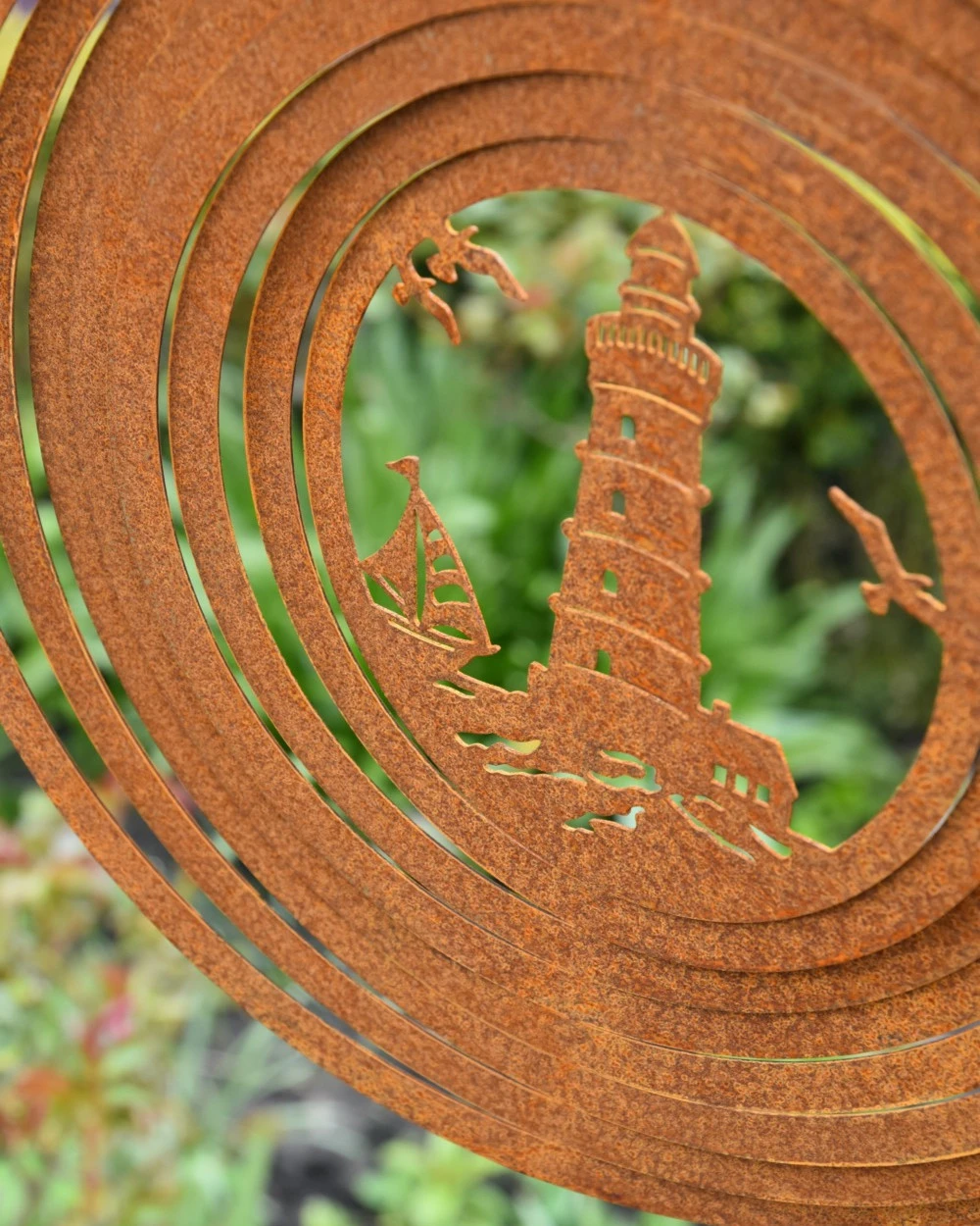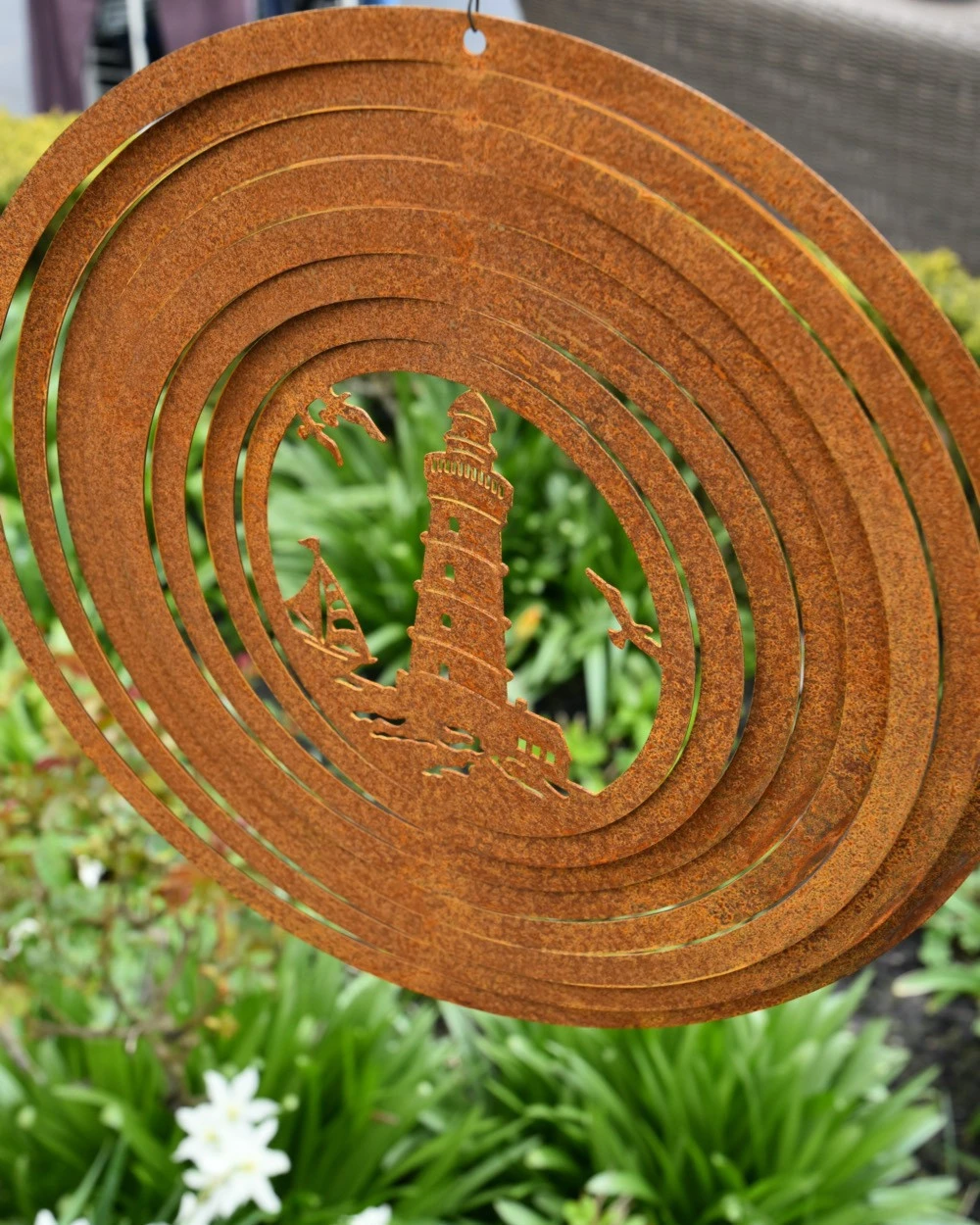 Wind vanger vuurtoren met bootje en meeuwen ecoroest. Deze leuke wind vanger van ecoroest is rond en heeft veel ronde spiralen en in het midden een uitgesneden afbeelding van een vuurtoren met een boot in het water en 3 vliegende meeuwen. Aan de bovenzijde zit een gaatje waar u een touwtje of ketting aan kunt doen om de windvanger op te hangen. Het geheel komt plat mee en u kunt het heel gemakkelijk uitvouwen zodat de wind zijn werk kan doen en de windvanger laat draaien in de wind.