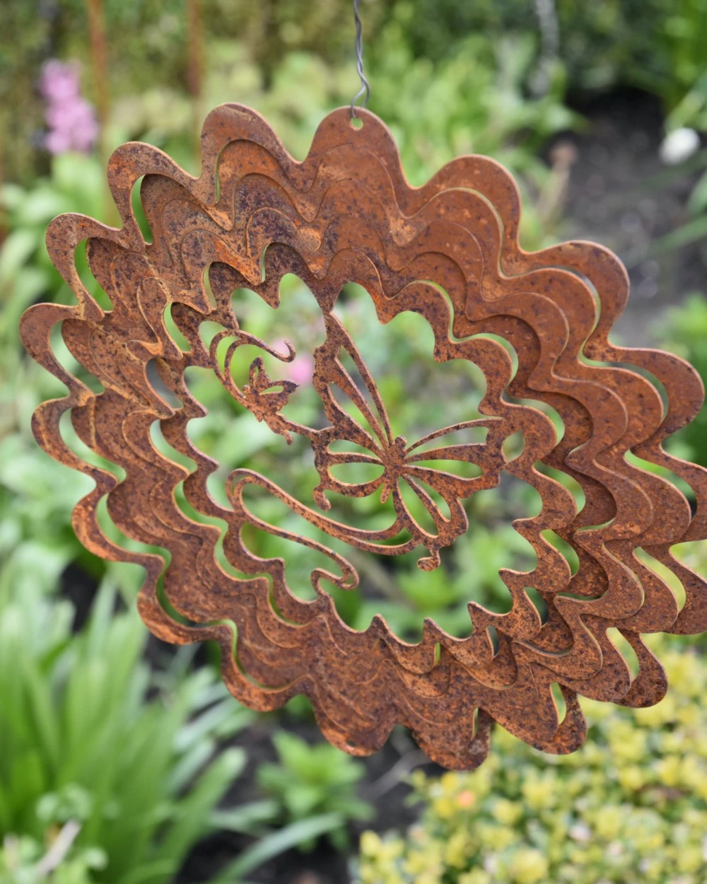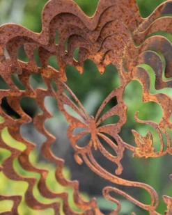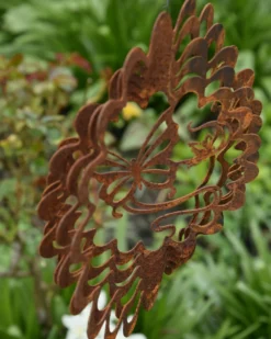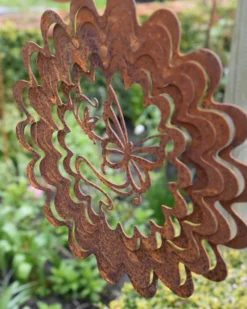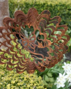 Wind vanger Vlinder in bloem ecoroest. Deze leuke silhouet windvanger van ecoroest heeft in het midden een vlinder met eromheen een steeds groter wordende bloem die als een spiraal rond de vlinder zit. De boven en onderzijde heeft een gaatje waar u een touwtje of ketting aan kunt hangen zodat hij in de tuin met de wind kan spelen. Door de wind zal de windvanger gaan draaien en het geheel siert uw tuin op. De windvanger wordt plat geleverd, het is heel makkelijk om de spiralen in een mooie positie te buigen om zo de wind z’n werk te kunnen laten doen.