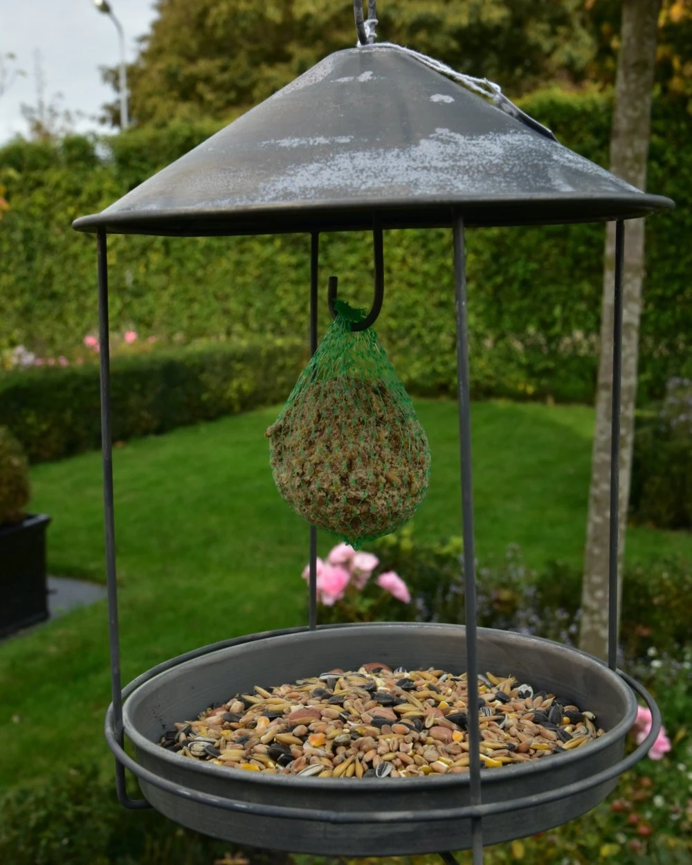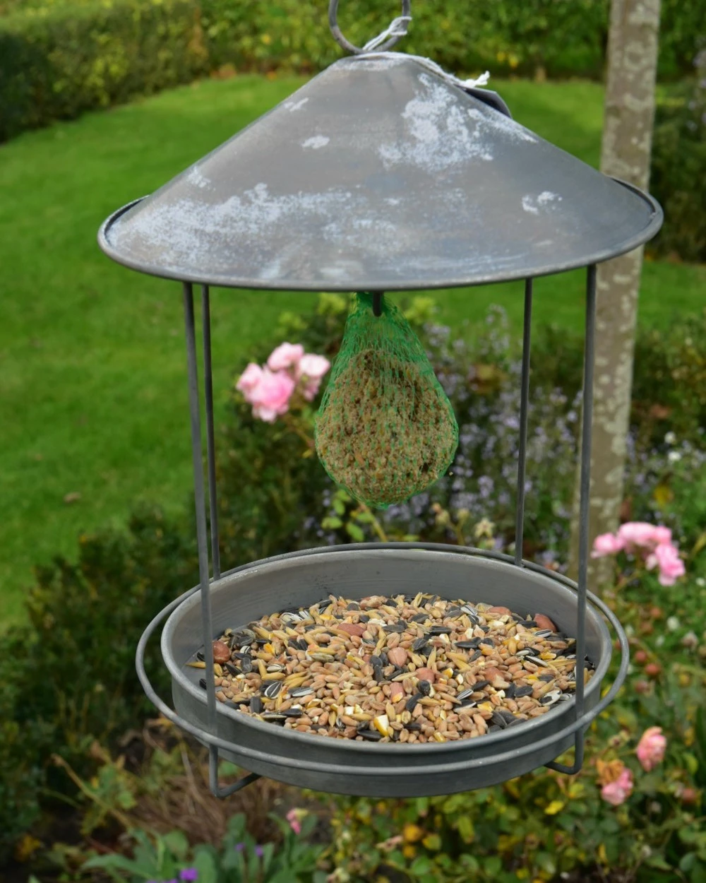 Zink vogel voederhuisje rond. Dit leuke voeder huisje is rond en ken makkelijk worden opgehangen. Onder het dak zit een haak waar u bv een vetbal kunt hangen en de bodem bestaat uit een rond schaaltje waar bv los vier in kan. In het bakje voor het losse voer zit een gaatje zodat het eventuele regenwater eruit kan. Het voederhuisje is ook in het rechthoekig verkrijgbaar.