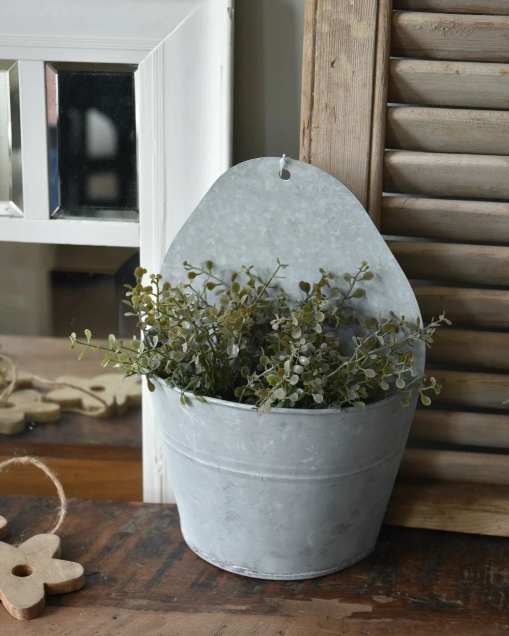 Zinken pot half rond voor aan de muur, IB Laursen. Deze leuke zinken pot pot is half rond met een hoge platte achterkant waar een ophang gaatje in zit. U kunt de pot leuk aan de muur hangen en er een mooie ‘kunst’ plant in zetten bijvoorbeeld. De pot is van metaal en heeft een zink-look afwerking. Wanneer u er binnen een echte plant in zet kunt u het beste plastic of een binnenpot gebruiken, de pot is niet waterdicht. Ook zal de pot wanneer hij langdurig nat is gaan roesten, dit hoort bij de charme van dit product.